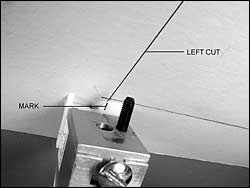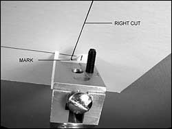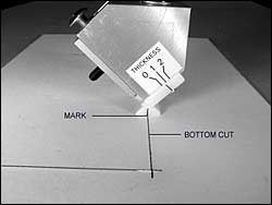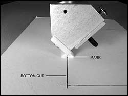 - Position the knifehead against the right hand stops. Make a mark on the recessed surface of the foot in line with the right hand vertical cut. This mark is used for setting the knife postion for the begining of the cut.